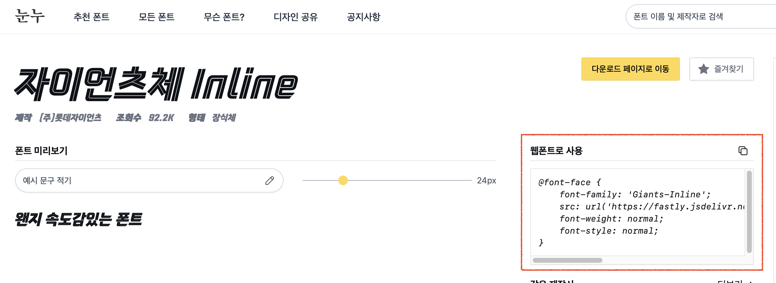 사이트에서 원하는 폰트를 클릭 후 → 웹폰트로 사용 코드 복사하기