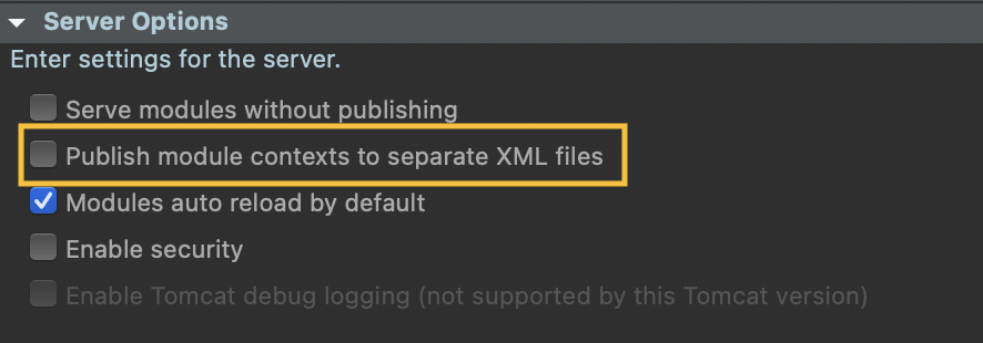 하지만 하나 찾은 것은 서버 클릭해서 Server Options 안에 Publish module contexts to separate XML files를 체크하는 방법도 있다고 합니다.