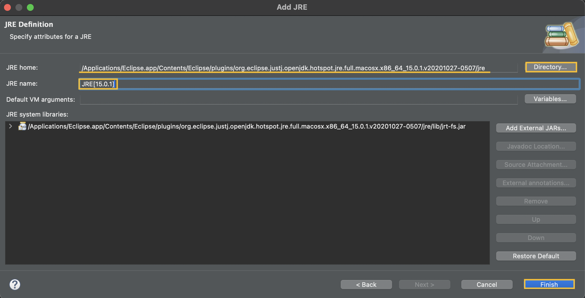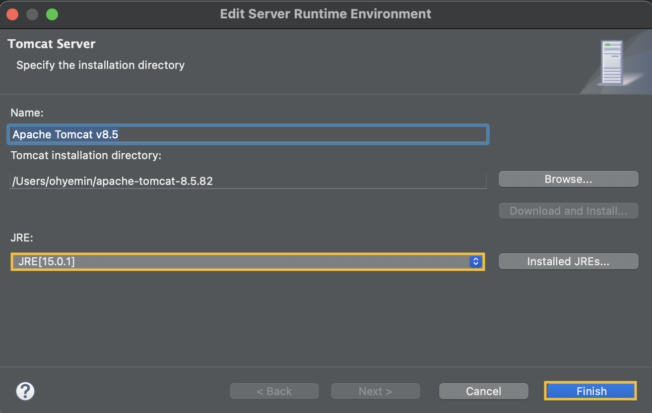 Directory 에 가서 위에 캡쳐해둔 JRE home 의 위치대로 추가해주고, JRE name 도 똑같이 합니다. 그럼 Finish.