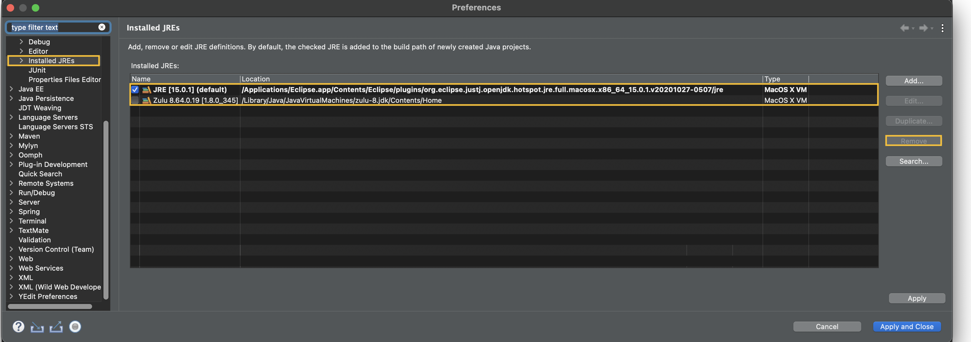 Installed JREs 부분에 있는 파일을 클릭 후 Remove 해줍니다.