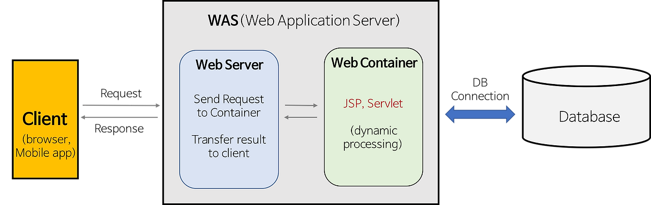 쉽게 말하면, WAS 는 웹 서버에서 요청을 받아서, 받은 요청을 웹 컨테이너로 보내어 로직을 수행하고, 다시 수행 결과를 웹 서버를 통해 클라이언트에게 전달해 주는 역할을 한다